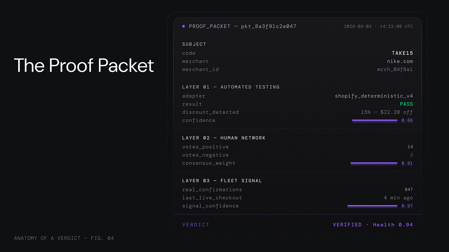 When your AI assistant says “I found a 20% discount at Nike,” it needs to answer. Is this code real? Will it work for this cart? What is the confidence level? What is the evidence? That is not a coupon lookup. That is a verification API call. The Proof Packet is the answer.