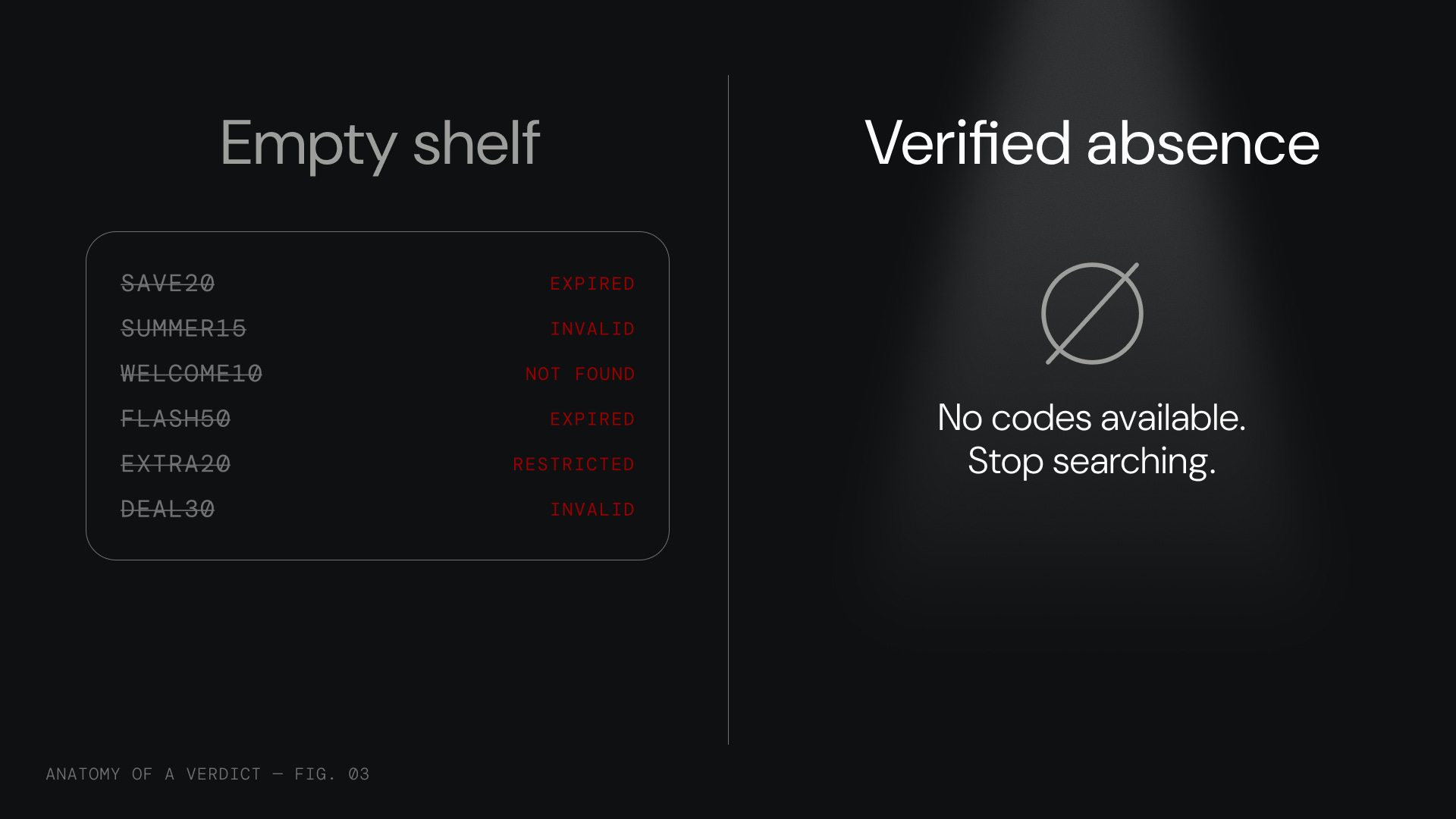 That sentence contains our entire product philosophy. Every coupon site in the industry is afraid to tell you “we have nothing.” Showing nothing feels like failure. Showing something, anything, even a dead code from 2019, feels like value.