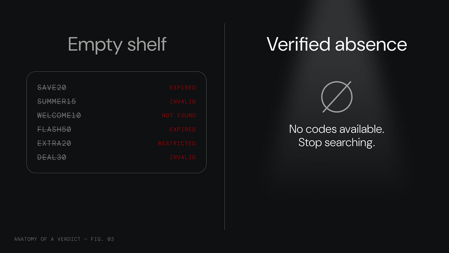 A second honest disclosure. We verify existence, not arithmetic. Confirming that “20% off” actually produces a 20% discount on your specific cart total is harder than it sounds. Merchants calculate discounts differently. Display results differently. We catch existence and function. Arithmetic verification is an active build.