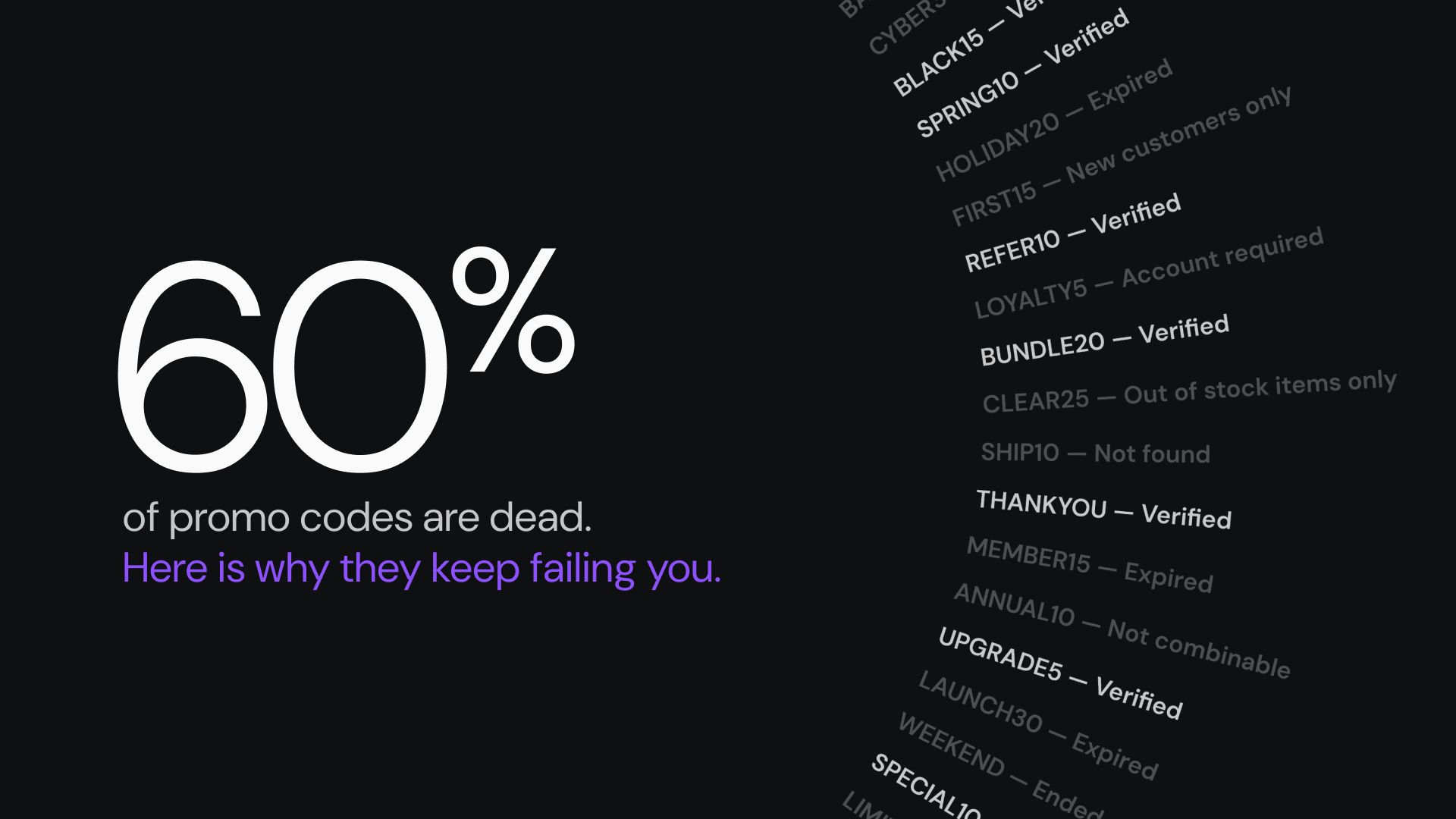 Forty to sixty percent of promo codes on the public internet are dead, restricted, or misleading. Not one problem. Five.
