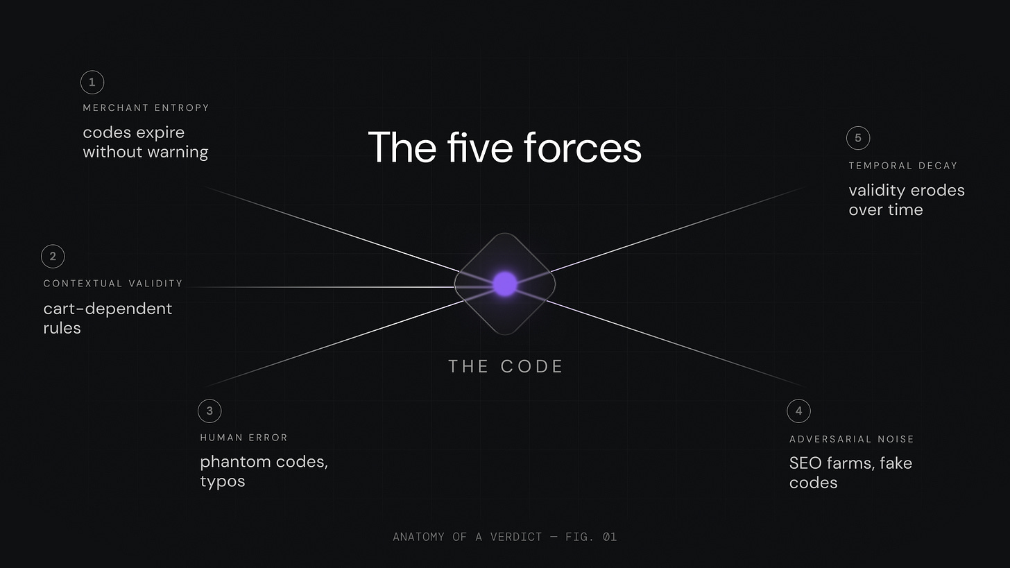 The five forces above are not a data problem. They are an adversarial environment. Codes decay at variable rates. Merchants change their systems without warning. The same code is simultaneously true and false depending on cart context. The ecosystem is polluted with codes that were never real.