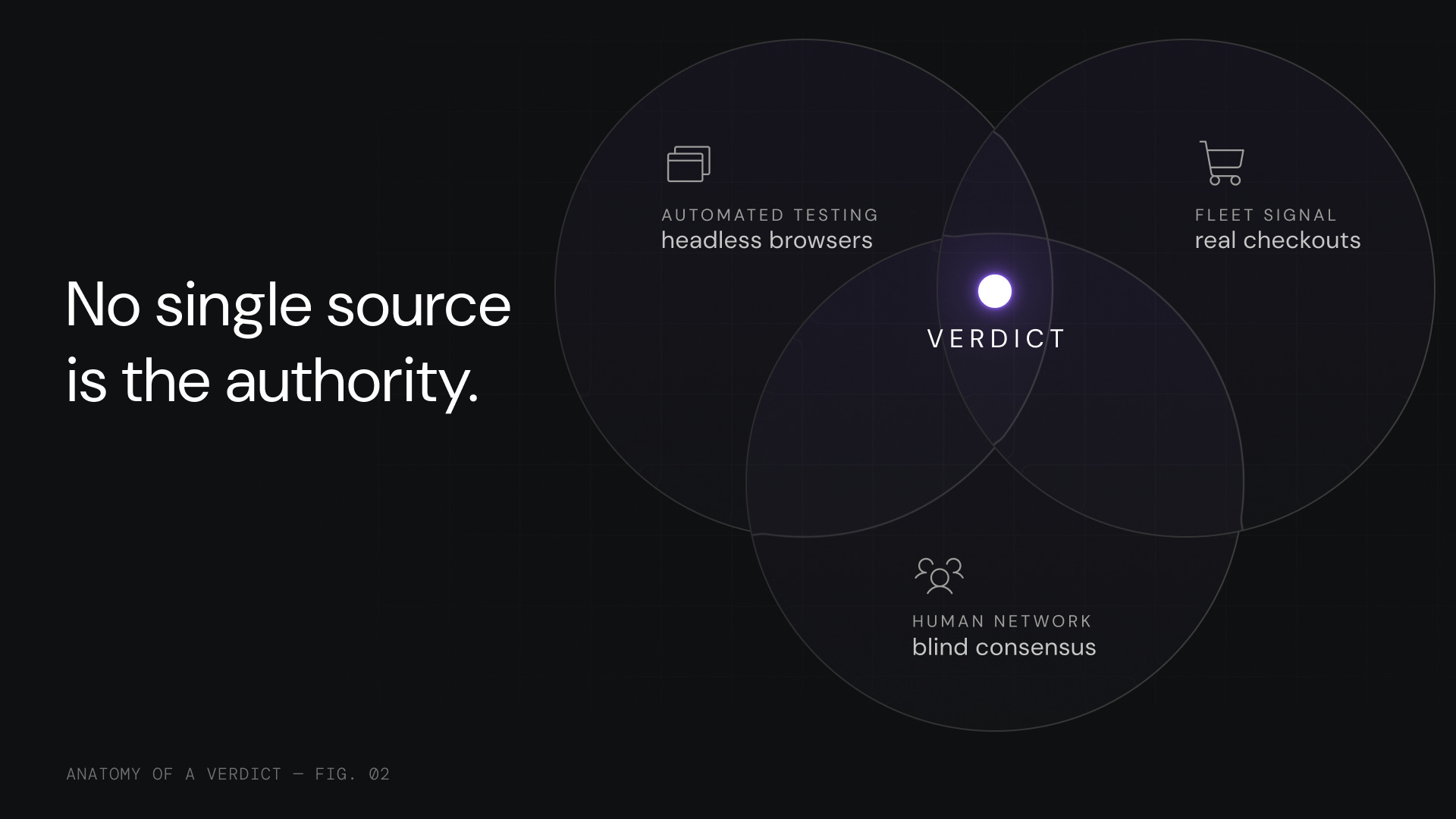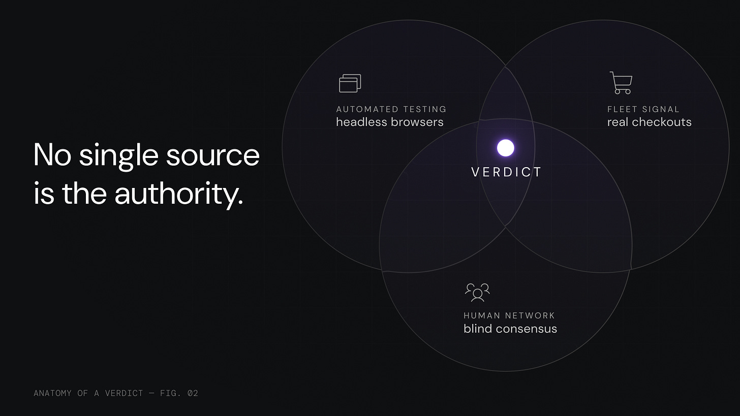 And a third. Merchants actively resist verification. Bot detection, CAPTCHAs, dynamic checkout flows, anti-automation defenses. When automated testing is blocked entirely, the multi-layer architecture catches what bots cannot. That is the point of the stack.